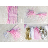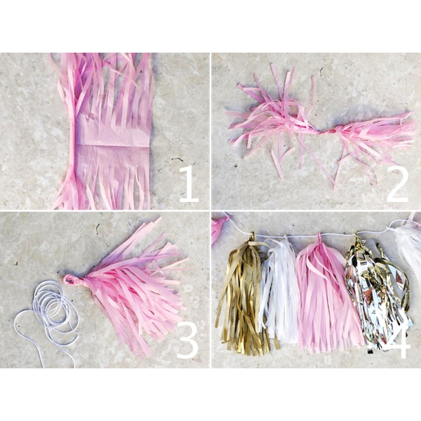 Tassels av folie selges 5 stk. i pakken. Disse kommer flatpakket fra oss, men de er veldig enkle å lage (se DIY bildet til venstre). Du kan gjerne kombinere ulike farger for å skape din egen tassel girlander som vil passe perfekt til festens fargetema.