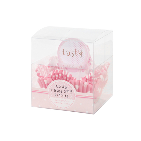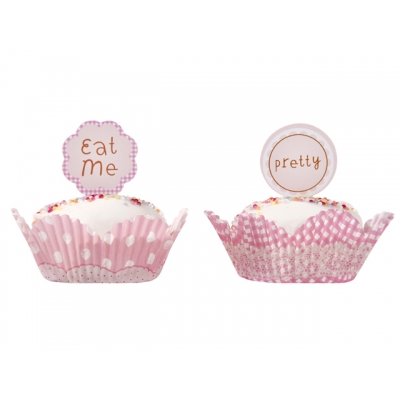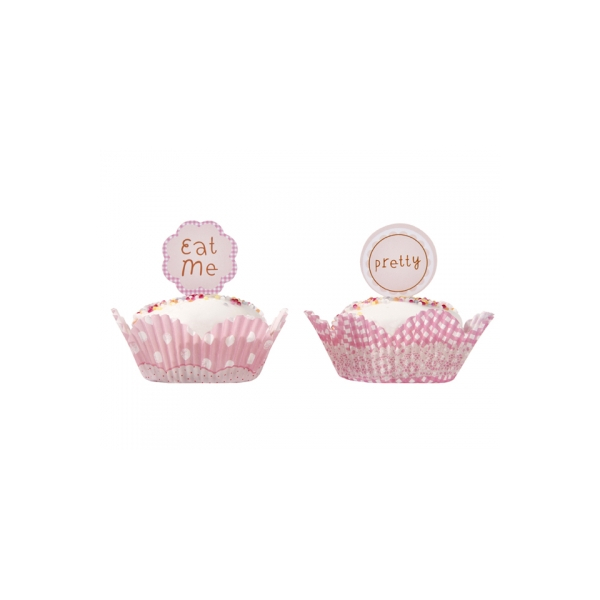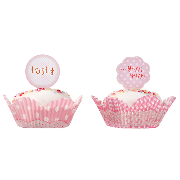 50 rosa muffinsformer i papir av to typer og 25 toppers i 4 morsomme design finner du i pakken.